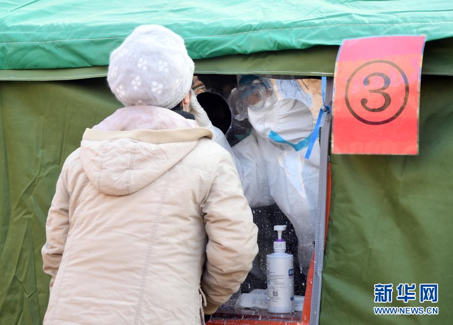 2021年1月3日,在北京市顺义区双丰街道香悦西区采样点,医护人员(右)采集核酸样本。