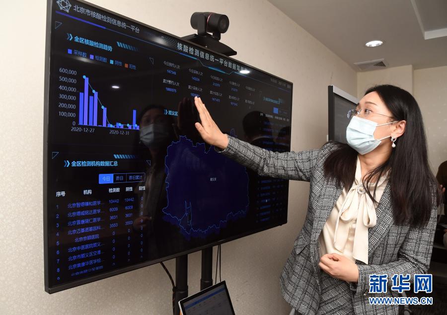 2021年1月3日,在北京市顺义区的一处核酸检测机构,工作人员介绍北京市核酸检测信息统一平台。