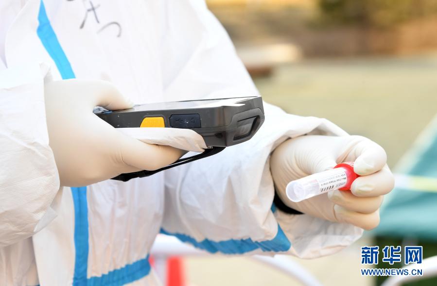 2021年1月3日,在北京市顺义区双丰街道香悦西区采样点,工作人员通过译码终端录入核酸检测采样试管的信息。