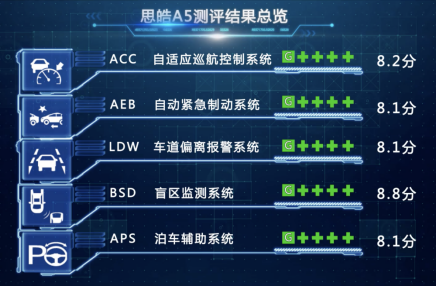 通过布置在车辆侧后方的2颗毫米波雷达,思皓A5有效对两侧盲道进行监测,并通过明显的报警灯提示给与驾驶者变道辅助,精准可靠的监测与明显的提示让思皓A5获得了优秀的成绩。最终,思皓A5凭借强大的产品力获得5项全优的成绩,力压群雄成为同级别产品中最能打的车型。