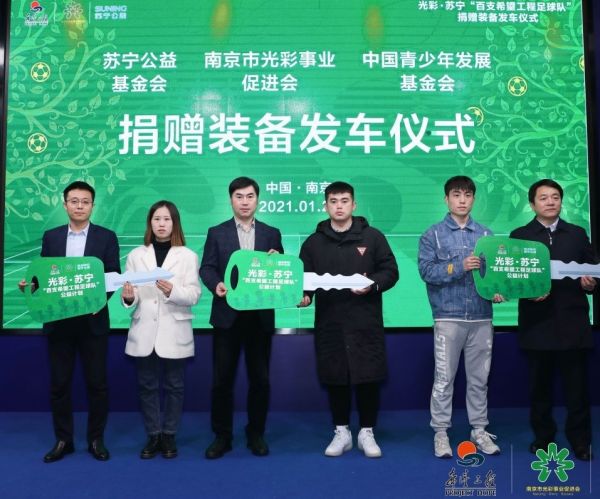 2020年,“光彩•苏宁‘百支希望工程足球队’公益计划”正式启航,由中国青少年发展基金会、南京市光彩事业促进会、苏宁公益基金会联合发起,已经开展了受助学校遴选、开学第一课等落地工作。此次捐赠装备发车仪式的举行,标志着公益计划进入实施新阶段,并将依托各方注入的优势资源,持续助力乡村足球教育事业的新发展。