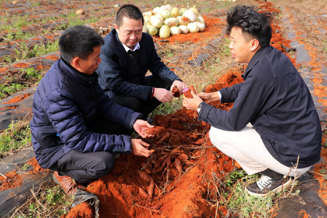 袁军(中)和徐志远(右一)在紫薯地里调研