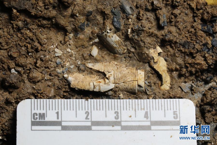 这是在三星堆遗址考古发掘现场5号“祭祀坑”内出土的象牙雕刻残片(资料照片)。新华社发 (四川省文物考古研究院供图)