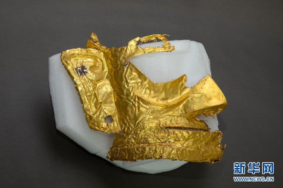这是三星堆遗址考古发掘现场5号“祭祀坑”出土的残缺的金面具(3月17日摄)。新华社记者 沈伯韩 摄