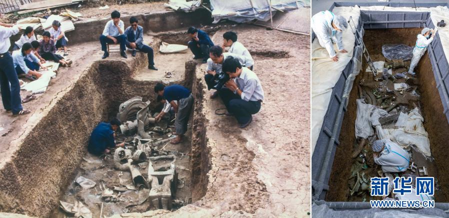 这是一张拼版图片:左图为1986年,工作人员在三星堆遗址考古发掘现场2号“祭祀坑”内清理文物(考古学家陈德安供图);右图为3月10日,在三星堆遗址考古发掘现场,考古人员在3号“祭祀坑”内工作(新华社记者 沈伯韩 摄)。