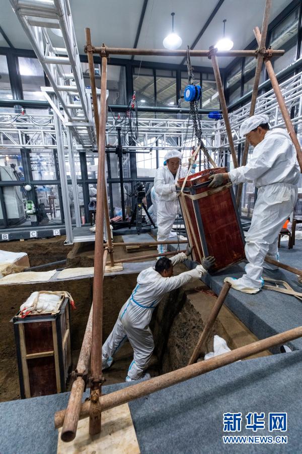 在三星堆遗址考古发掘现场,工作人员利用特制的升降设施,将整体提取的两个剖面柱运出7号“祭祀坑”(3月17日摄)。这些剖面柱将能为研究者展现该“祭祀坑”内地层堆积的样貌。