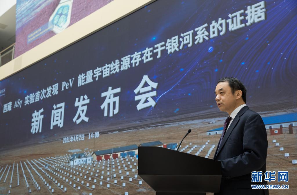 4月2日,在中国科学院高能物理研究所举行的发布会上,王贻芳院士在致辞。新华社记者 金立旺 摄