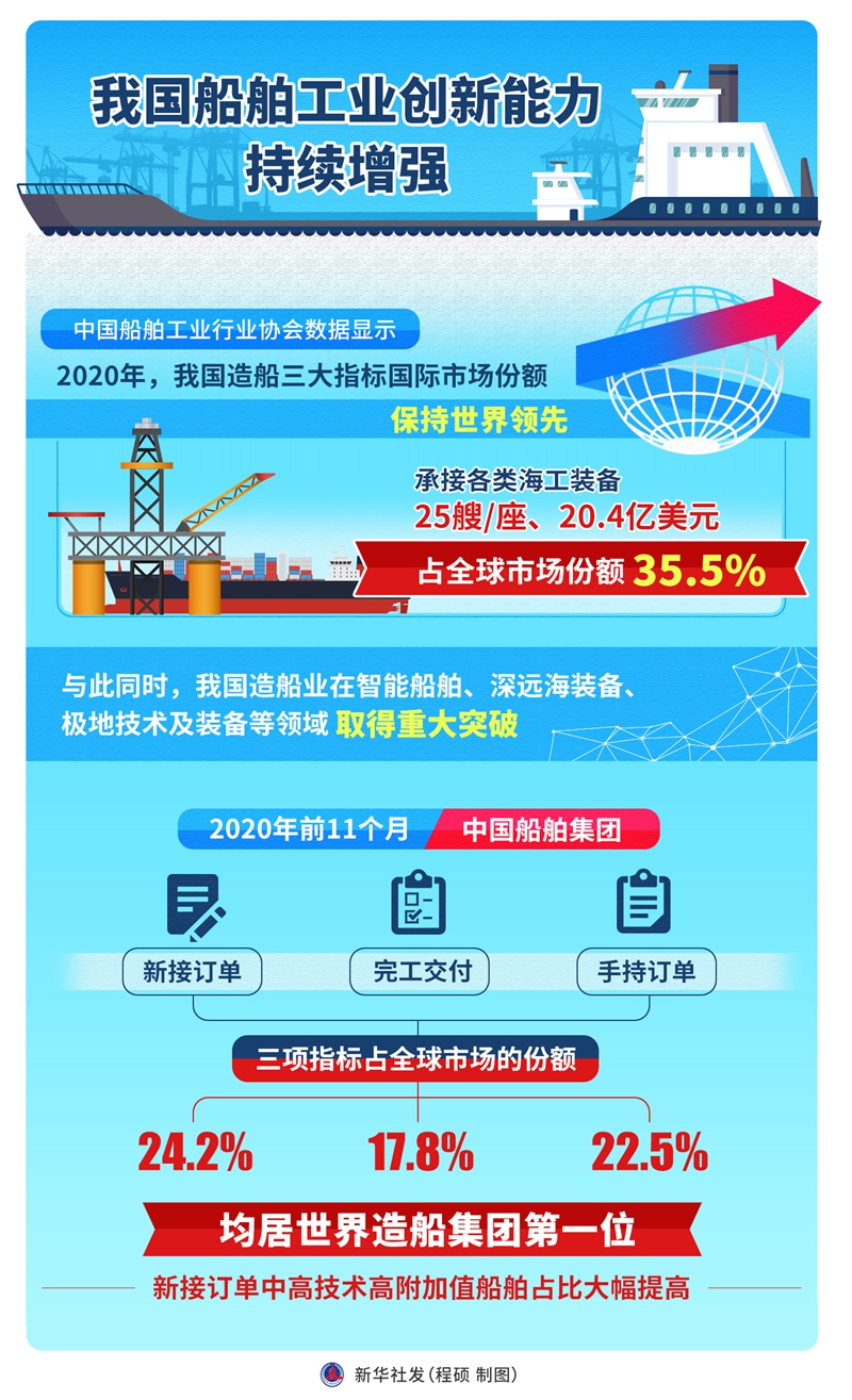 2020年前11个月,中国船舶集团新接订单、完工交付和手持订单三项指标占全球市场的份额分别为24.2%、17.8%、22.5%,均居世界造船集团第一位,新接订单中高技术高附加值船舶占比大幅提高。