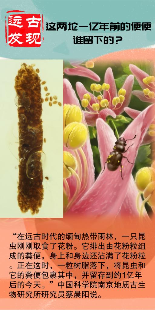 新华社南京4月14日电(记者王珏玢)记者14日从中国科学院南京地质古生物研究所获悉,中、英古生物学者近期在约1亿年前的缅甸琥珀中发现两枚由大量花粉组成的昆虫粪便化石。在粪便化石附近,还有身上沾着花粉的昆虫化石,这为证实昆虫在约1亿年前就已经为被子植物传播花粉提供了直接证据。