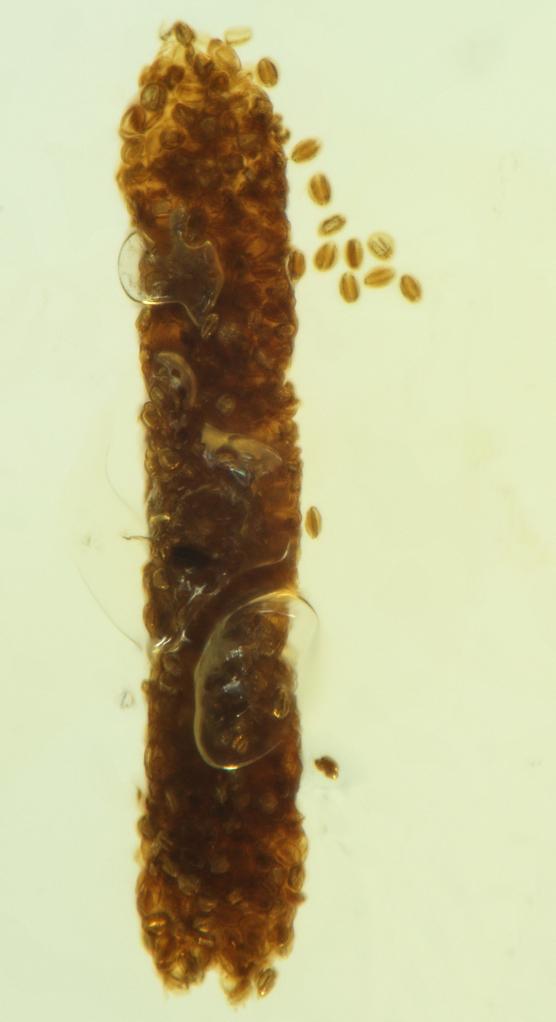 领导此项研究的中科院南古所研究员蔡晨阳介绍,在琥珀化石中发现昆虫和它的粪便非常罕见。此次,科研团队共研究了超过2.5万枚琥珀,才在其中发现一个这样的案例。从形态上看,新发现的两枚昆虫粪便整体呈长柱状,由上千枚极为微小的椭球型花粉粒组成。距离粪便不到2毫米处,即为新发现的短翅花甲昆虫化石。这种昆虫的腹部和腿,长有便于附着花粉的毛。其虫体表面和四周,也散落着不少花粉颗粒。