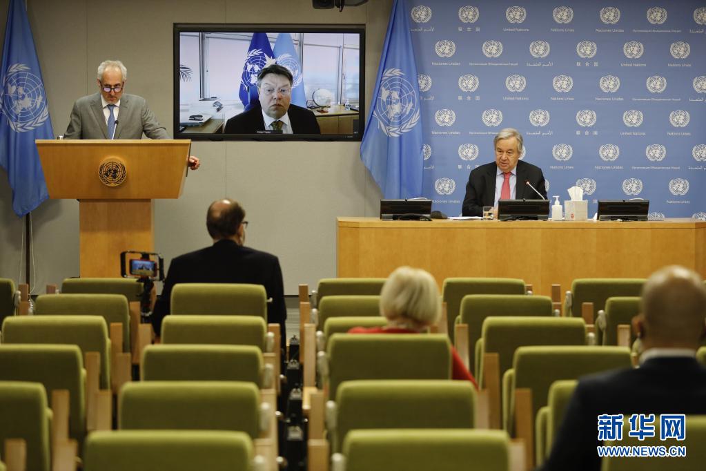 4月19日,联合国秘书长古特雷斯(右)在位于纽约的联合国总部与世界气象组织秘书长塔拉斯(屏幕中)共同出席新闻发布会。 新华社记者 谢锷 摄