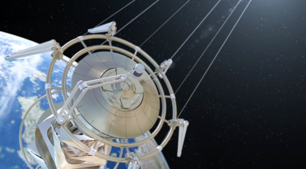 月球漫游之旅首先搭乘近地天梯,从建设在地球海面的海上基座出发,可载人载货的太空舱沿着由碳纳米管材料制成的天梯绳索来到地球空间站。再从这里发射,通过太空舱自带的动力系统飞向月球空间站。当太空舱与月球空间站对接后,便会再次沿着天梯绳索,搭乘近月天梯到达月球表面。
