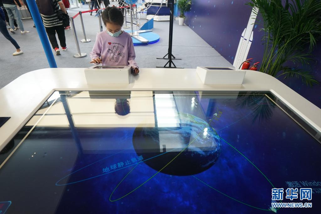 4月24日,小朋友在航天科普与成就展上体验“卫星设计”。