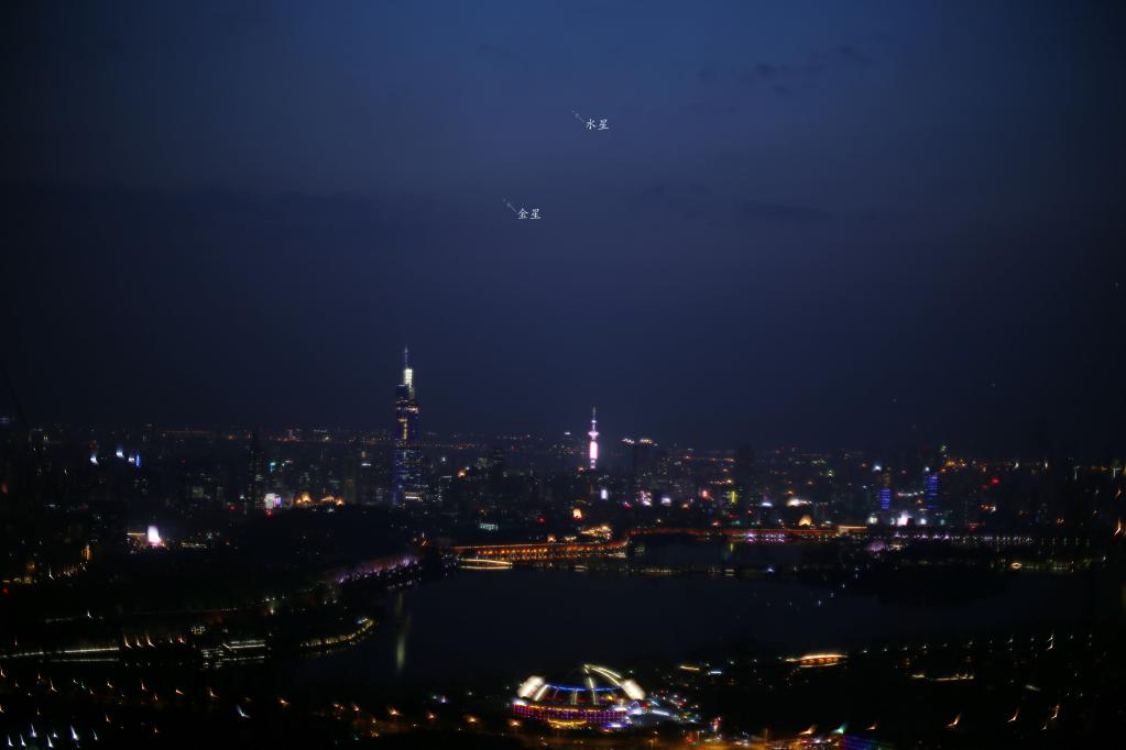 ↑在2018年3月15日水星东大距前夕,南京天文爱好者协会会员许军3月13日在南京拍摄的水星和金星相聚的照片。(许军供图)