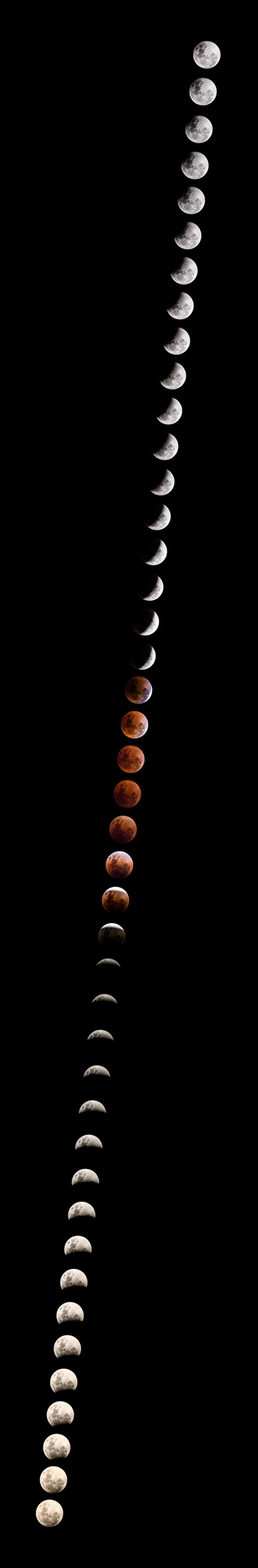 ↑南京天文爱好者协会会员姚慷2018年1月31日拍摄的“月全食葫芦串”照片。(姚慷供图)