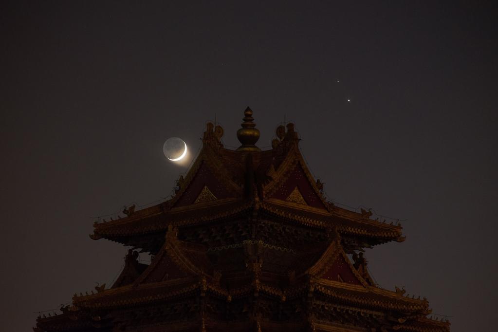 北京市天文爱好者郑志2020年12月17日在故宫角楼拍摄的“土木伴月”照片。(郑志供图)