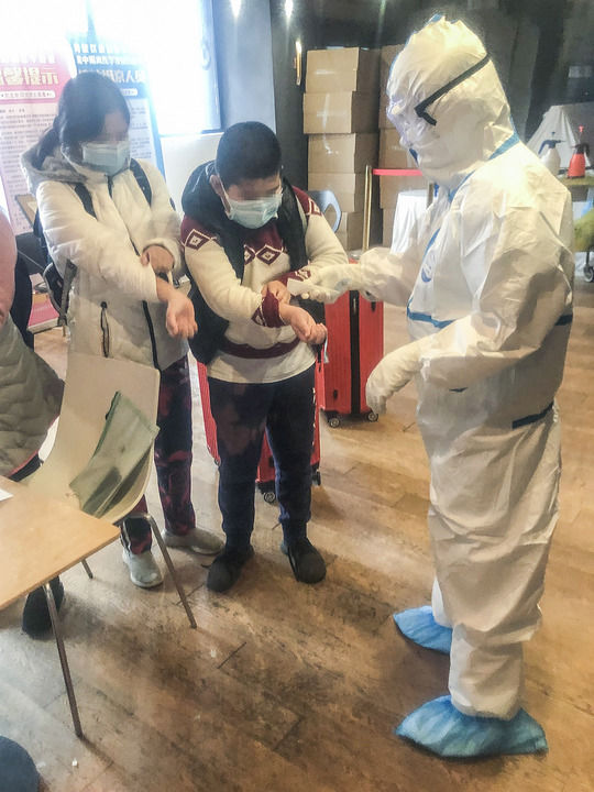 2月12日,喜大夫在北京市海淀区一处集中医学观察点为刚刚抵达的客人测体温(手机照片)。新华社发