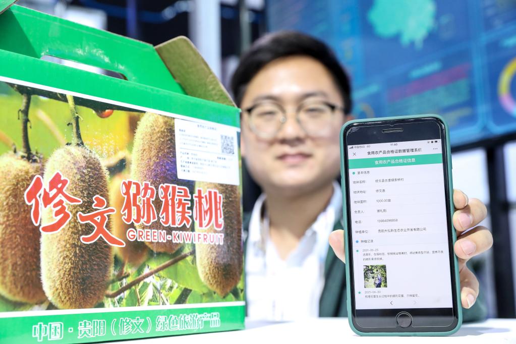 5月26日,工作人员在数博会上展示通过农产品大数据溯源系统查询猕猴桃信息。新华社记者 欧东衢 摄