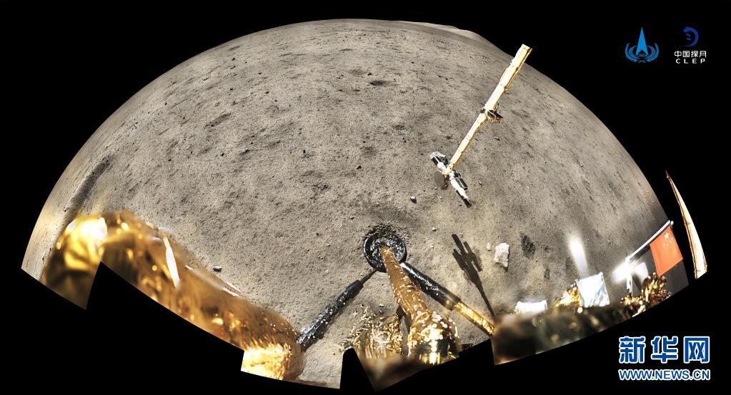 2020年12月4日,国家航天局公布了探月工程嫦娥五号探测器在月球表面国旗展示的照片。嫦娥五号着陆器和上升器组合体全景相机环拍成像,五星红旗在月面成功展开,此外图像上方可见已完成表取采样的机械臂及采样器。新华社发(国家航天局供图)
