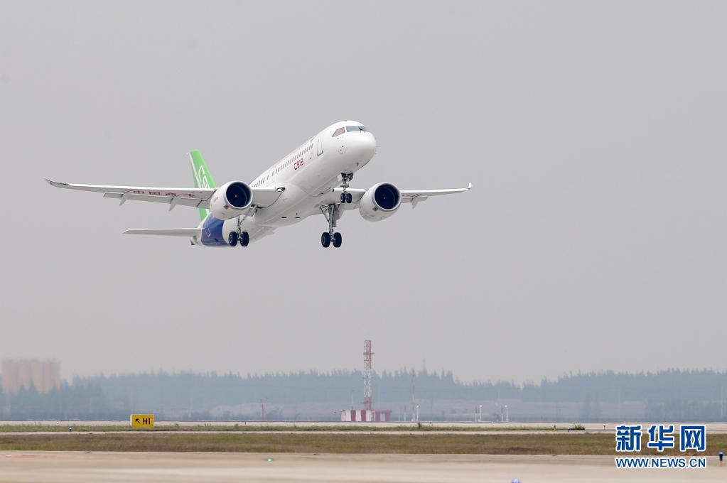 2017年5月5日,国产大型客机C919在上海浦东国际机场首飞成功。新华社记者 丁汀 摄
