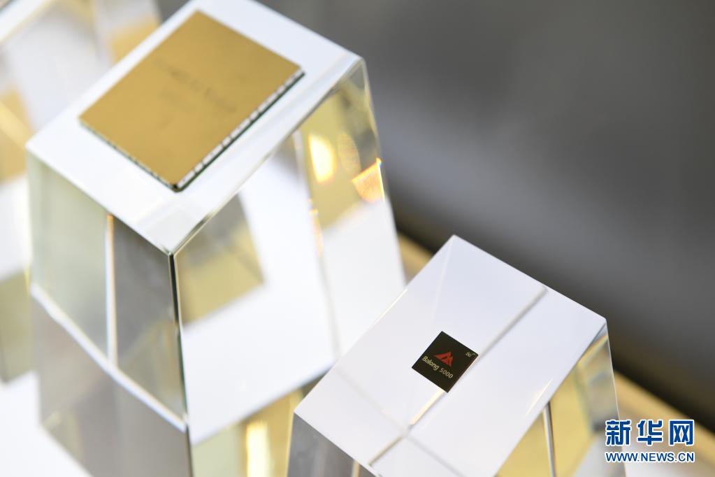 2019年10月23日拍摄的巴龙5000芯片以及搭载该芯片的5G工业模组。新华社记者 毛思倩 摄