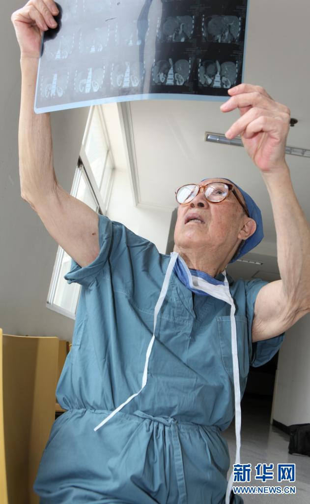 年近90的吴孟超院士在手术后分析患者的核磁共振结果(2011年4月13日摄)。新华社发(张鹏 摄)