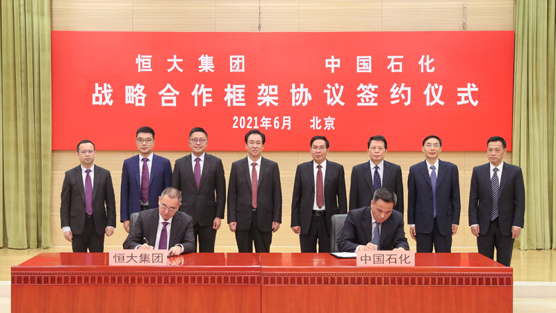 6月11日,恒大集团与中国石油化工集团战略合作签约仪式在北京举行,中国石化副总经理凌逸群和恒大集团总裁夏海钧代表双方签署了战略合作协议,中国石化董事长张玉卓和恒大集团董事局主席许家印携双方高管出席活动并见证签约。