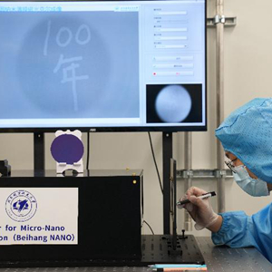 6月24日,在北京航空航天大学,集成电路学院科研人员在5个原子层厚的纳米磁性薄膜上写下“100年”。新华社记者鞠焕宗摄