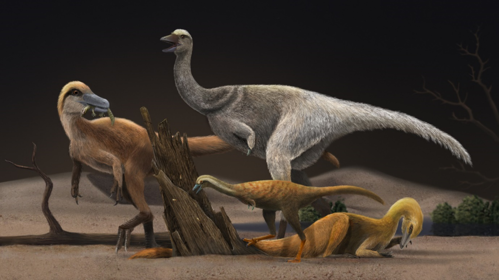 四种代表性的阿尔瓦雷斯龙类的生态复原图,展现不同演化阶段阿尔瓦雷斯龙类恐龙体型和食性的差异。韩志信绘,中科院古脊椎所供图
