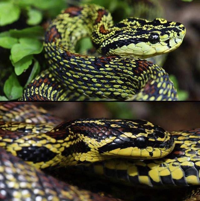 图片说明:秦岭地区同域分布的剧毒蛇菜花原矛头蝮(上)与无毒的新种秦皇锦蛇(下)在外观上极其相似。(受访者供图)