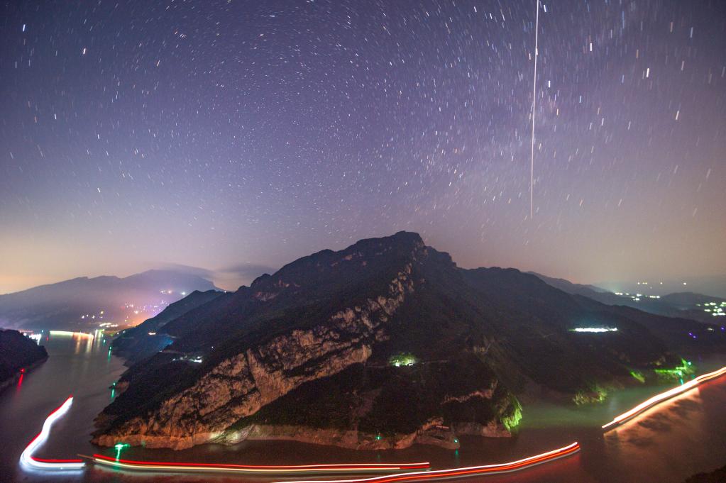 湖北省天文爱好者雷勇2021年7月13日在湖北省宜昌市秭归县拍摄的天和核心舱飞过长江西陵峡江段。(本人供图)