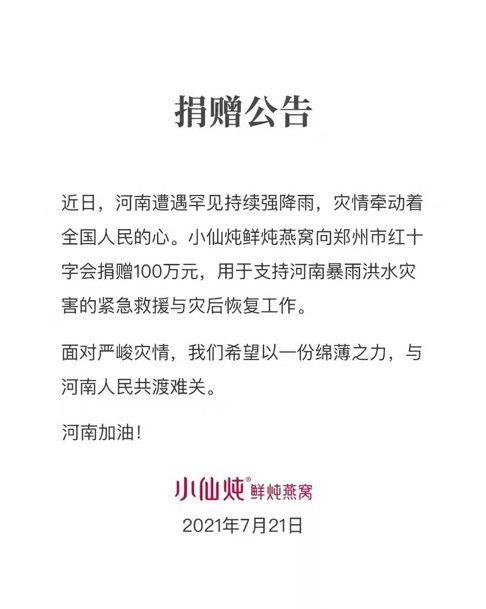 小仙炖方面表示,面对严峻灾情,小仙炖公司希望以一份绵薄之力,与河南人民共渡难关。