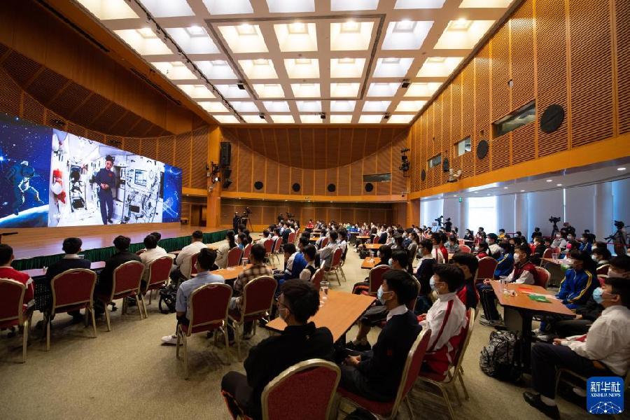 12月9日,学生们在北京中国科技馆观看王亚平(右)展示如何在太空中饮用再生水。 新华社记者 金立旺 摄