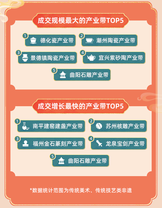 截至6月底,有14个非遗产业带在淘宝上年成交过亿。作为日用程度最高的商品,陶瓷相关的非遗产业带规模也是最大的。德化瓷产业带、潮州陶瓷产业带、景德镇陶瓷产业带、宜兴紫砂陶产业带分别占据了成交规模前五位中的4席。有意思的是,规模最大的前五个产业带中,唯一非陶瓷类的曲阳石雕,同时也是成交快速增长的产业带之一。