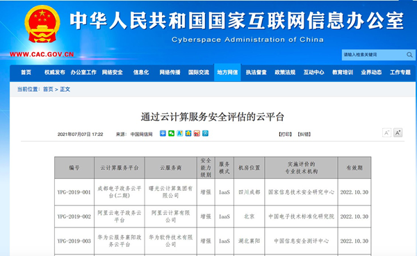 近日,国家互联网信息办公室官方网站更新了“通过云计算服务安全评估的云平台”名单,阿里云、腾讯云、华为云等43个云平台入选。其中,阿里云金融云平台、湖南省省级电子政务外网统一云平台、星云大数据福建省电子电子政务云计算平台为今年新增的三个平台。
