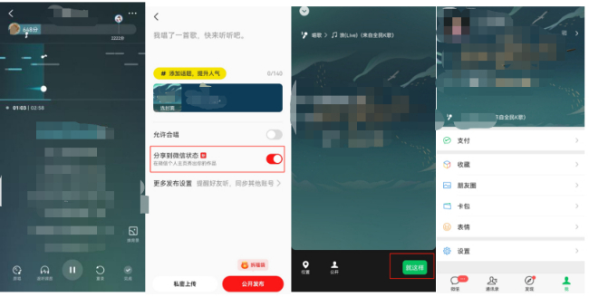 将全民K歌APP升级至最新版,用户在完成歌曲演唱后,进入作品发布页,勾选“分享到微信状态”,输入当下的心情想法,即可生成专属声音“微信状态”。除了分享自己新鲜出炉的演唱作品,自己或其他好友已公开发布的作品也支持一键分享到微信状态。回到微信状态,还可以聆听好友分享的K歌好声音,发现朋友圈里的“隐藏麦霸”。