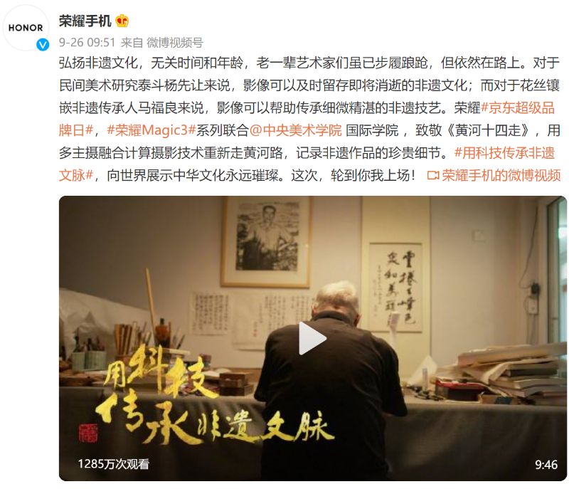 9月26日,荣耀联合中央美术学院国际学院及艺术家杨先让和马福良,发起“科技传承非遗文脉”主题活动,荣耀Magic3系列凭借非凡影像系统及全新的多主摄融合计算摄影技术,记录黄河流域非遗文化珍贵细节,以科技创新赋能非遗文化传承,最大程度展现和传承中国传统文化底蕴。