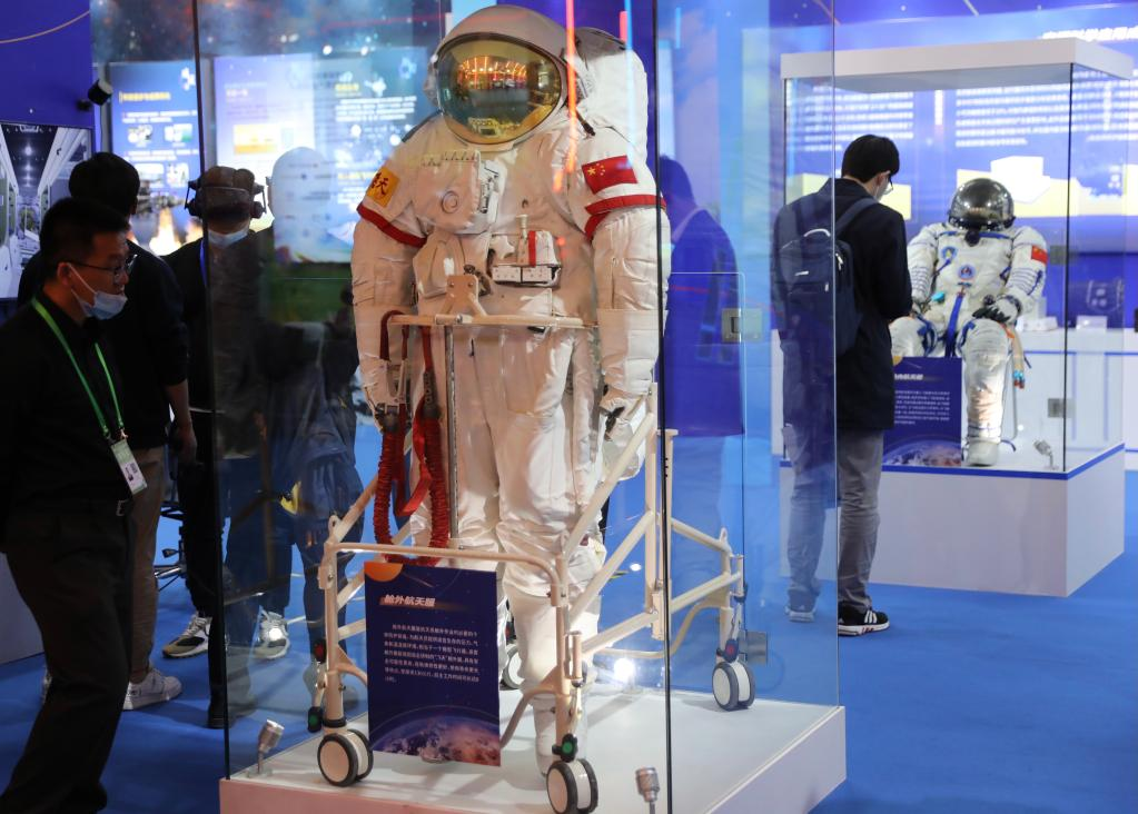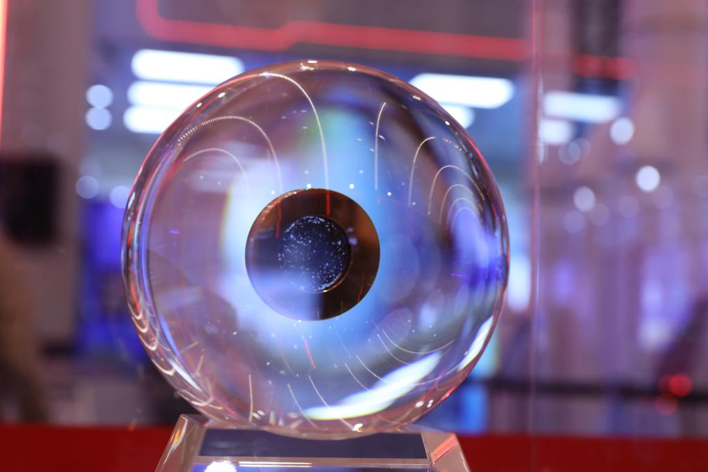 水晶球包裹着49毫克刚从月球取回的样品稳稳立于底座之上,这件寓意着“海上生明月”的珍贵实物展品成为观众必去“打卡点”。四周不远处,中国空间站模型高悬半空,祝融号火星车、“玉兔号”月球车模型依次排开,载人飞船舱内航天服、舱外航天服“真衣”出场,大飞机、大火箭昂扬错落矗立于间……
