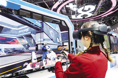 图为观众在展会现场头戴VR眼镜、手持手柄操作游戏 张鹏摄