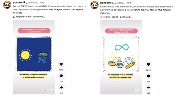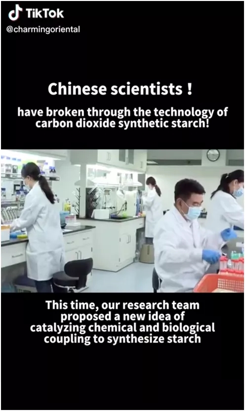 “也许就在不久将来,世界上将有很多淀粉合成工厂,不仅不用像农作物那样占据大规模土地,还能减少空气中的二氧化碳。”TikTok上分享中国见闻的创作者@niniinchina畅想。超过20万网友给她点赞。
