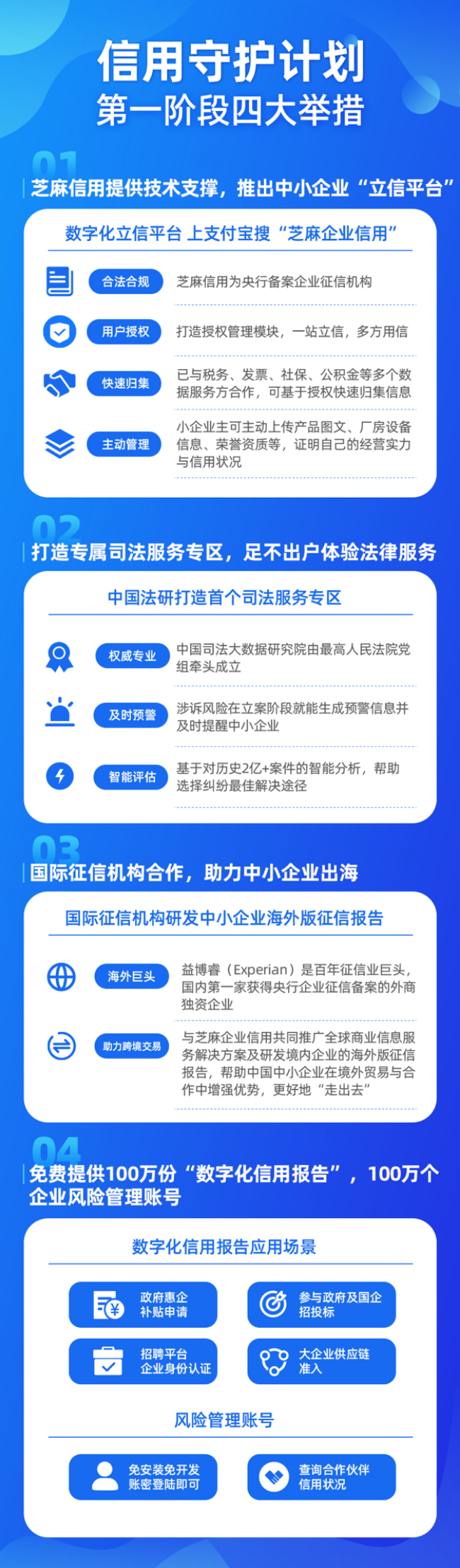 据悉,信用守护计划的参与机构,第一阶段将推出四大具体举措,包括推出推出中小企业立信平台、打造司法服务专区、研发境内企业海外版信用报告、提供数字化信用报告和风险管理SaaS服务账号各100万个等。
