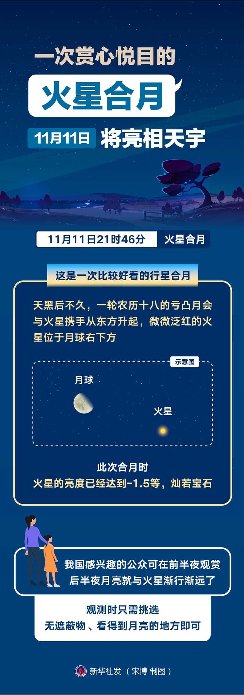 新华社天津11月9日电(记者周润健)微微泛红的火星与皎洁明亮的月球近距离“相遇”会擦出怎样的火花?天文科普专家介绍,11月11日晚,一次赏心悦目的火星合月将亮相天宇,届时只要天气晴好,我国感兴趣的公众凭借肉眼就能目睹这幕浪漫的“星月童话”。