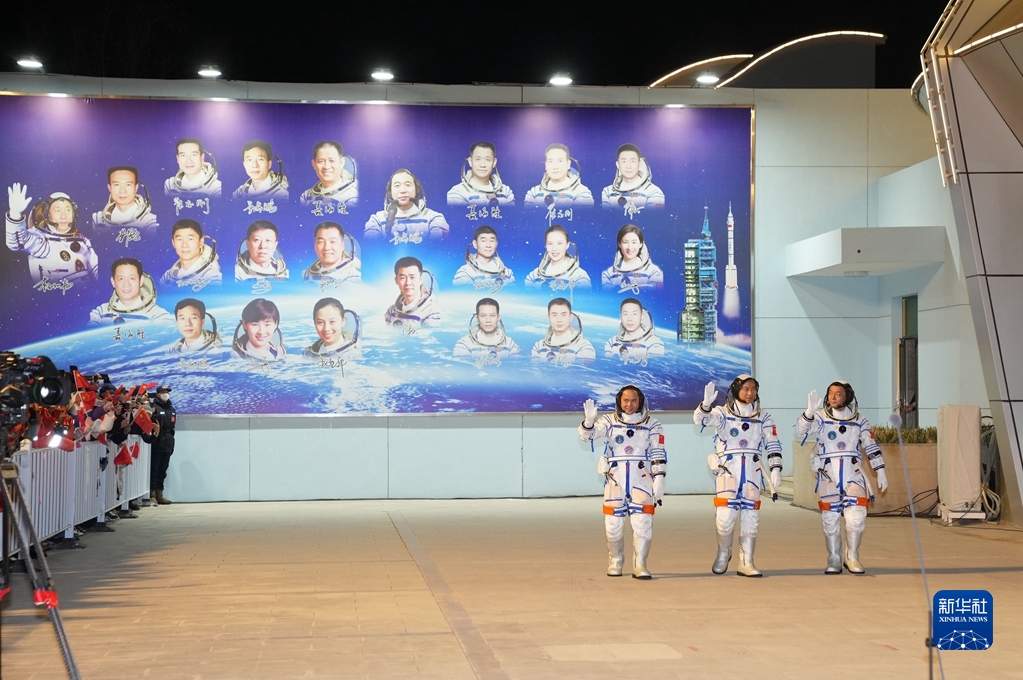 11月29日晚,神舟十五号载人飞行任务航天员乘组出征仪式在酒泉卫星发射中心问天阁广场举行。新华社记者 李刚 摄