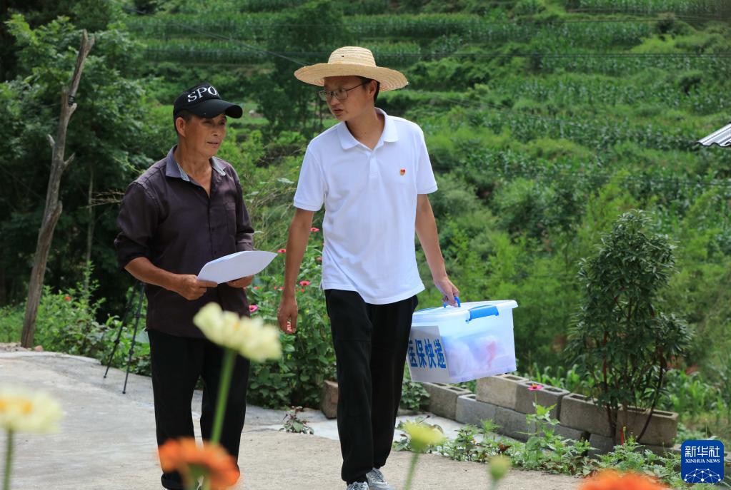 2022年7月5日,湖南省张家界市武陵源区天子山街道黄河村的“医保快递员”(右)在了解群众诉求。新华社发(吴勇兵 摄)