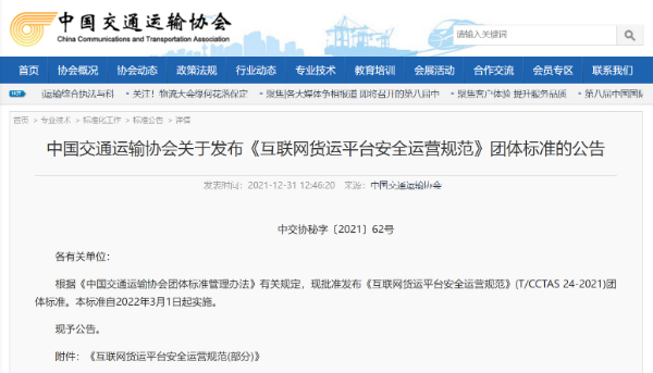 近日,中国交通运输协会发布了《互联网货运平台安全运营规范》(下称《规范》)团体标准,对于提高平台货运企业安全运营水平有着重要促进作用,该标准将于2022年3月1日起正式实施。交通运输部科学研究院与深圳依时货拉拉科技有限公司为牵头起草单位。