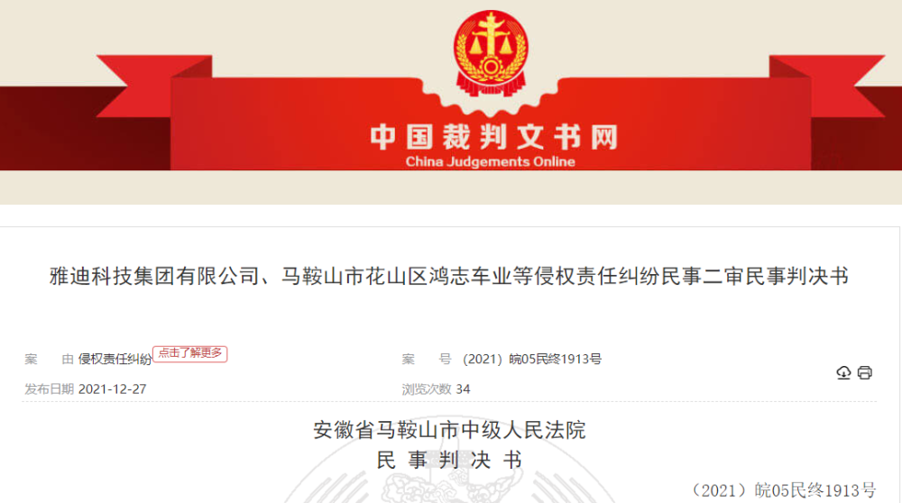 2021年12月27日,中国裁判文书网公示了《雅迪科技集团有限公司、马鞍山市花山区鸿志车业等侵权责任纠纷民事二审民事判决书》((2021)皖05民终1913号),裁定书详细披露了本案的相关细节。