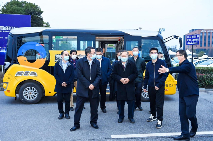 李毅中、李克强院士一行乘坐体验蘑菇车联自动驾驶公交车