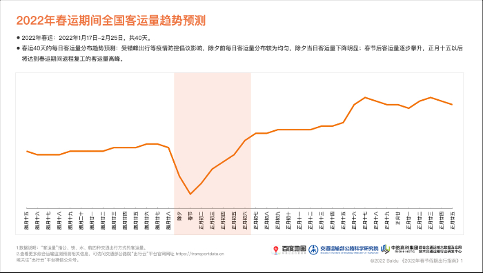 1月21日,百度地图联合交通运输部公路科学研究院、综合交通运输大数据及应用技术交通运输行业研究中心(中路高科)等单位发布《2022春节假期出行指南》(以下简称为《指南》)。《指南》预测,节前客运量将保持平稳,2月6日或将迎来返程高速拥堵高峰。