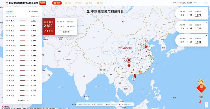 针对春运期间的全国交通态势,百度地图今年全新上线了交通出行大数据平台。该平台包含中国高速公路网拥堵监测、中国主要城市拥堵排名及城市拥堵详情、中国重点客运交通枢纽拥堵监测、中国重点购物中心拥堵监测、中国重点旅游景区拥堵监测五大板块,供社会公众、相关政府部门和新闻媒体使用,在服务公众出行的同时也为城市管理决策提供科学的数据支撑。