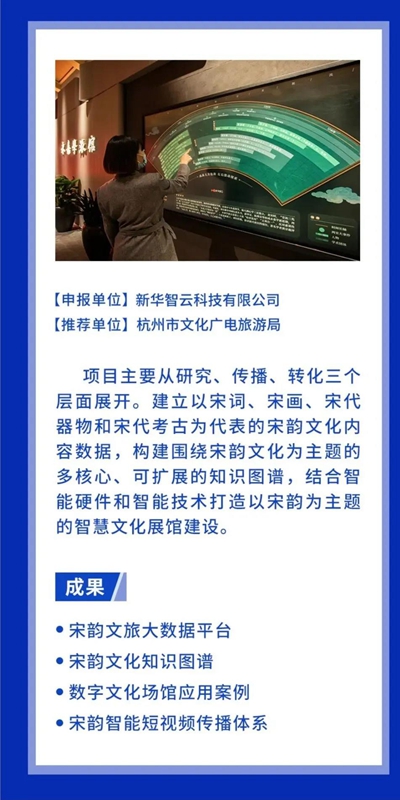 近日,新华智云“宋韵文化知识图谱构建及在文化场馆中的数字化应用示范”,成功入选浙江省文旅厅“2021年度浙江省文化和旅游科技创新示范项目名单”孵化项目,全省仅7项,且是唯一“宋韵”主题项目。链接:首批立项!2021年度浙江省文化和旅游科技创新示范项目立项名单公布。
